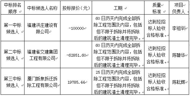 招標(biāo)編號為廈至信施招[2019]第12號的觀音山C04地塊臨時建筑拆除工程建設(shè)項目,該工程建設(shè)項目施工招標(biāo)于2019年6月26日依法公開開標(biāo)后,評標(biāo)委員會按照招標(biāo)文件規(guī)定的評標(biāo)標(biāo)準(zhǔn)和方法進(jìn)行了評審,根據(jù)評標(biāo)委員會提交的書面評標(biāo)報告,現(xiàn)將評標(biāo)結(jié)果、否決其投標(biāo)的投標(biāo)人及否決原因公示如下: