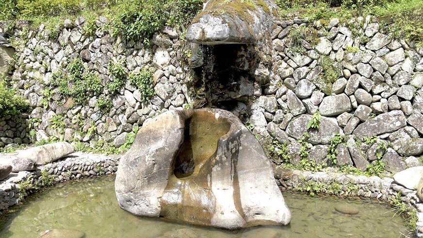 下黨鄉(xiāng)的滴水石穿主題園里,我們看到了小時候“滴水穿石”典故里的巨大石頭。烈日下,清水依舊流淌。