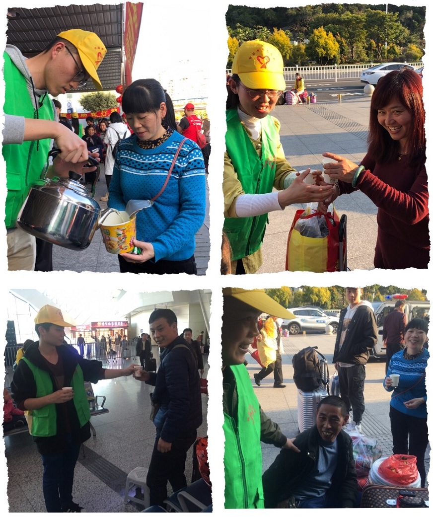 “請問我這張票要去哪里候車?”“請問一下梧村車站怎么走?”支部同志身著志愿者服裝一到場,就有許多受困旅客上前咨詢。每年春運期間國內各個火車站都會加派人手,做好各項準備工作。但即便如此,依然會有許多旅客遇到困難,并難以在密集的人群中尋求幫助,在這個時候,分布在火車站各個地方的志愿者就是受困旅客最好的幫手。無論是各個車次的具體候車點、自助取票機的位置,還是周邊的餐飲、百貨、汽車站路線,甚至旅客需要開水時,志愿者都有隨身攜帶熱水壺和紙杯為旅客提供方便。支部同志們無論走到哪,身邊都會圍繞許多尋求幫助的受困旅客,支部每一位同志都以最飽滿的熱情悉心答疑,以實際行動為人民服務。